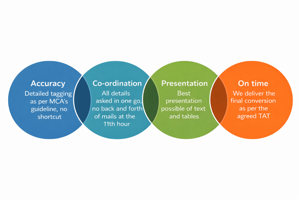 Contrary to common perception, XBRL software contributes only 10–15% to the overall conversion process, while the remaining 80–85% depends on domain expertise in understanding Financial Statements, proper tagging, and accurate placement of notes in the correct sections. At Azebon Services, we ensure precision, compliance, and reliability throughout the conversion process.